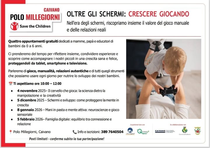 Presso lo Spazio Educativo 13-36 mesi delPolo Millegiorni di Caivano gestito dalla Cooperativa Il Quadrifoglio, un ciclo di incontri dal titolo “Oltre gli schermi: crescere giocando”, dedicato a genitori ed educatori di bambini da 0 a 6 anni.