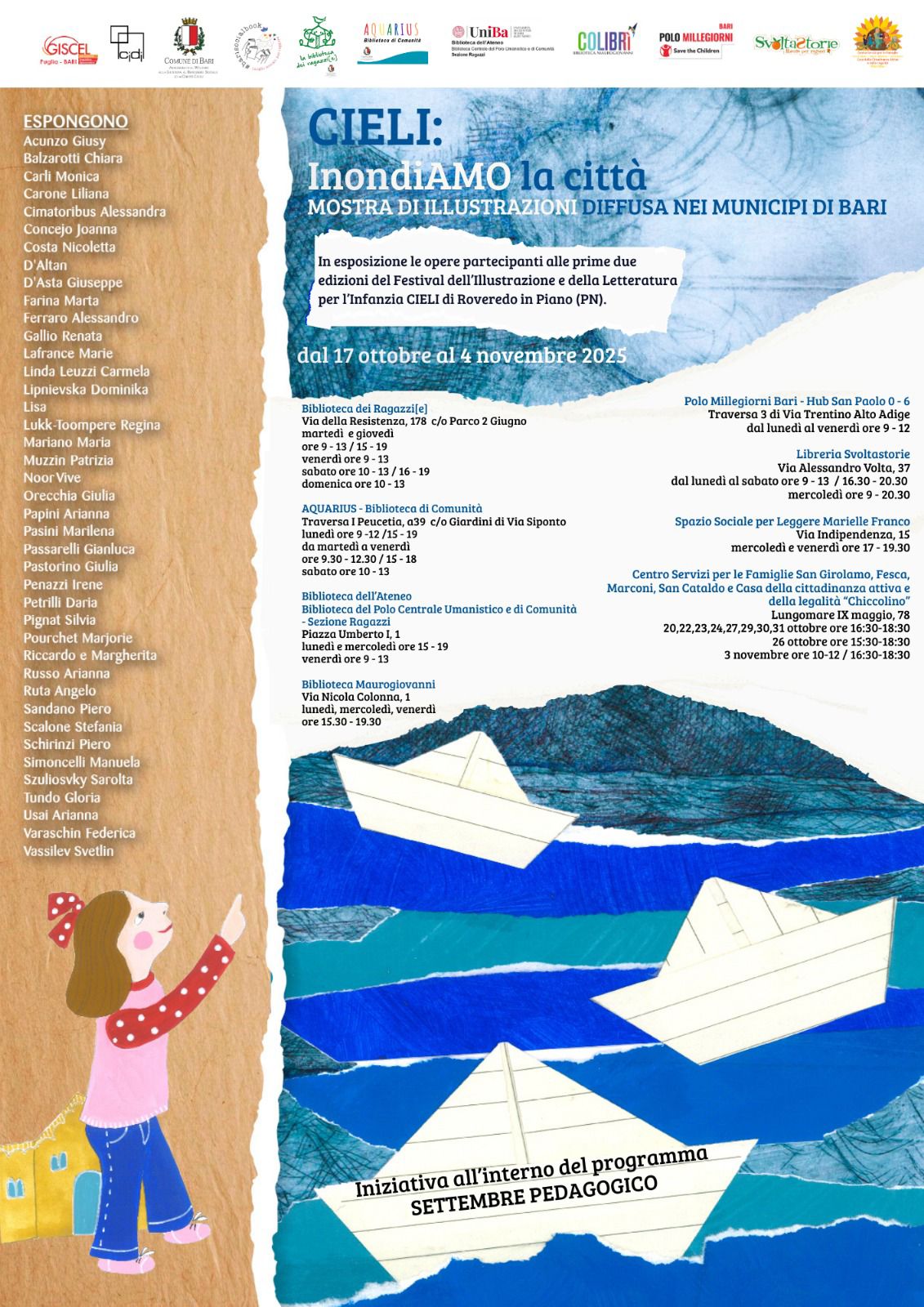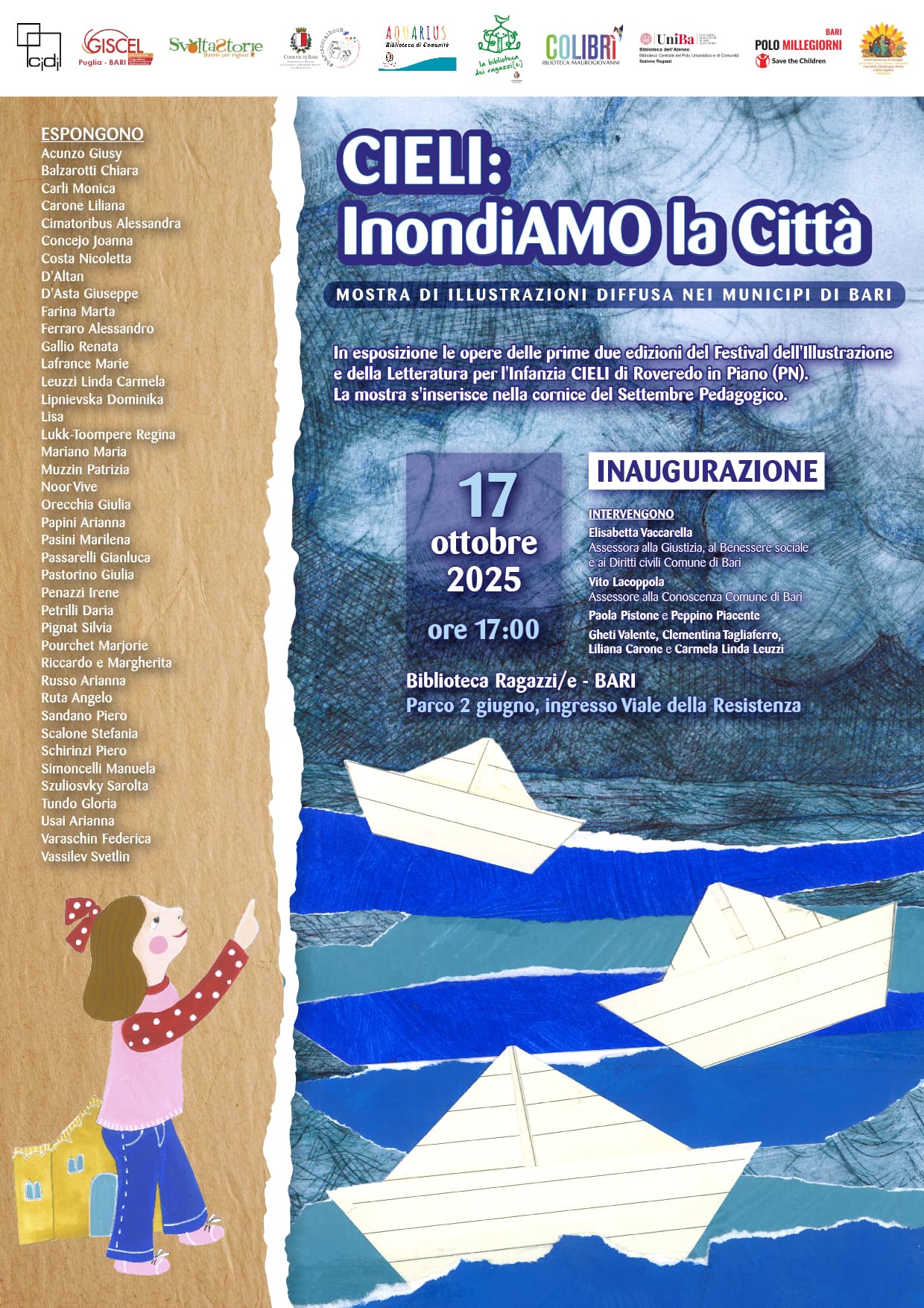 Dal 17 ottobre al 4 novembre 2025, a Bari, presso le biblioteche e  gli spazi culturali cittadini, arriva a Bari “CIELI: InondiAMO la Città”, la mostra diffusa di illustrazioni per l’infanzia che coinvolgerà i cinque Municipi con oltre 190 opere di artisti e artiste italiani e internazionali.